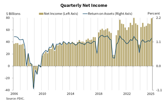 For the 4,379 FDIC-insured commercial banks and savings institutions, quarterly net income totaled $79.3 billion in the third quarter, up $9.4 billion (13.5%) from the prior quarter. The banking industry reported an aggregate return on assets of 1.27% in the third quarter of 2025, up from 1.13% in the second quarter of 2025 and 1.09% in the year-ago quarter. The quarterly increase in net income was driven by lower provision expense (down $9.2 billion, or 30.7%) and higher net interest income (up $7.6 billion, or 4.2%), which were offset by higher income taxes (up $5.0 billion, or 30.1%) and higher non-interest expense (up $2.9 billion, or 1.9%). The quarterly decrease in provision expense was largely attributable to the acquisition of one large bank in the prior quarter. Absent this large provision expense, net income still would have increased, as the industry experienced a $7.6 billion increase in net interest income and a $1.1 billion increase in non-interest income.
