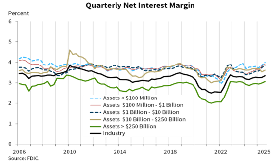 The chart below shows the average NIM for the industry and for five asset-sized stratifications. As can be seen, the NIM increased across all asset-size stratifications.