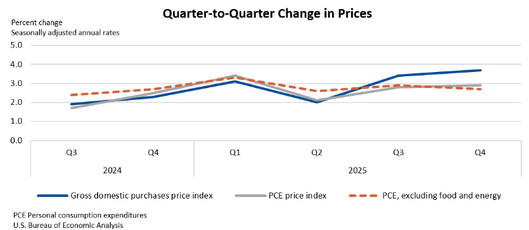 The price index for gross domestic purchases increased 2.6% in 2025, compared with an increase of 2.4% in 2024. The PCE price index increased 2.6%, the same increase as in 2024. Excluding food and energy prices, the PCE price index increased 2.8%, compared with an increase of 2.9%.