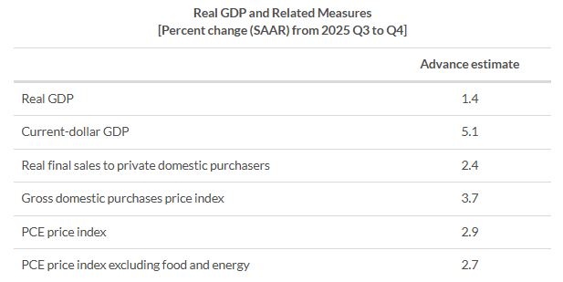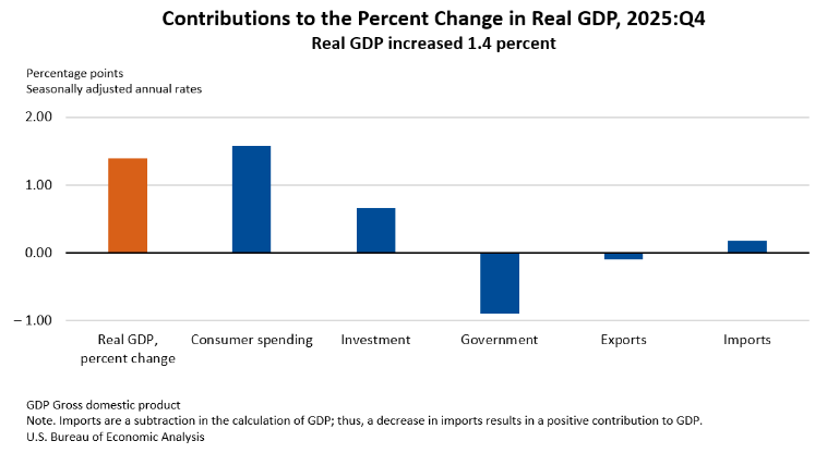 Real gross domestic product (“GDP”) increased at an annual rate of 1.4% in the fourth quarter of 2025 (October, November, and December), according to the advance estimate released today by the U.S. Bureau of Economic Analysis. In the third quarter, real GDP increased by 4.4%.